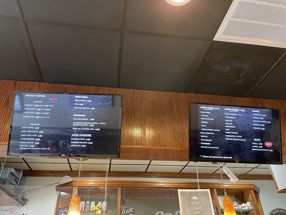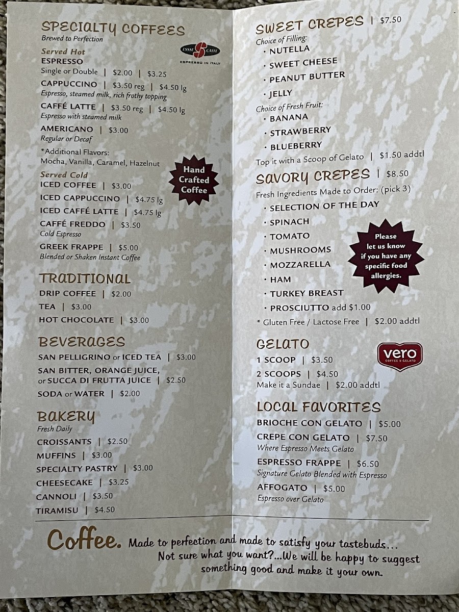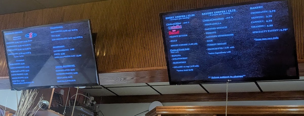 The menu highlights include items like the Nutella and banana crepes, Pistachio Cannoli, and signature drinks such as the Cloud 9 Latte and Greek Frappe. Seasonal desserts and classic favorites like tiramisu and cheesecake further enhance the experience, making it easy to find a delicious choice for both casual meetups and quiet solo moments.